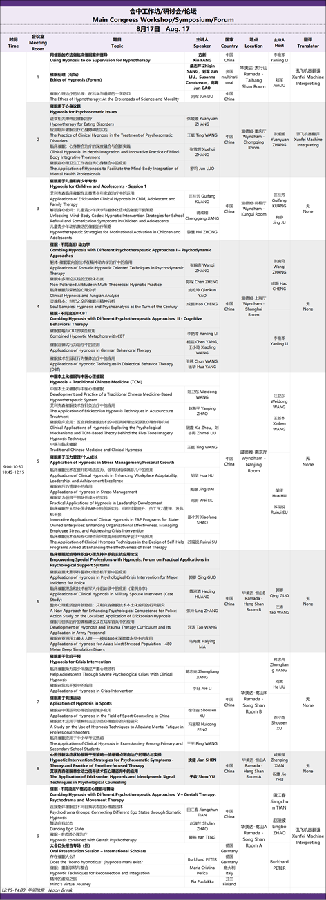 大会主体仅向专业人员开放,包括从事心理工作、临床催眠的专业人员(如医院医护人员、大学心理咨询老师、中小学心理老师、个人执业咨询师、特殊职业(公安、武警、解放军等)、社会工作者、心理学相关专业在校学生、心理教练等)及心理健康相关产业(心理测评、图书、仪器设备、软件硬件等)等。谢绝心理学爱好者和非专业背景人员参加。
