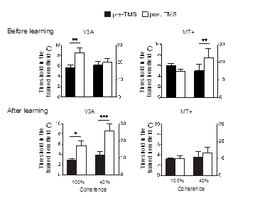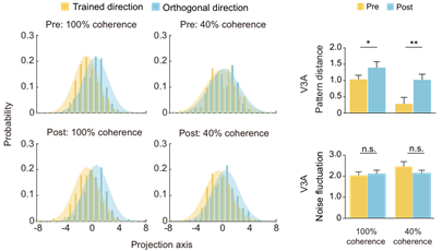 方方教授课题组结合功能性磁共振脑成像、经颅磁刺激和心理物理实验手段,发现知觉学习效应能够从习得的视觉任务迁移到未学习的视觉任务,导致正常成年人视觉系统的脑区功能的重塑。在这个研究中,成人被试练习对纯运动信号的方向进行辨别,这个学习效果可以迁移到含噪声运动信号的方向辨别中。在知觉训练前,通过施加持续短阵快速脉冲刺激(coutinuous theta-burst stimulation, cTBS)干扰特定脑区活动,经颅磁刺激实验结果表明, 视皮层V3A区和颞中回视觉运动区(MT+)在纯运动和噪声运动这两种任务中具有双分离的、因果的决定性作用。而知觉训练后,颞中回视觉运动区在噪声运动任务中的决定性作用被V3A脑区所取代。进一步地,课题组应用多体素模式分析方法(multi-voxel pattern analysis, MVPA)考察功能性磁共振成像实验结果,发现上述功能替代现象伴随着V3A区对两种任务视觉刺激的神经表征的精确度提高,具体表现为支持向量机(Support vector machine, SVM)分类器解码正确率的提高,以及线性判别分析(Linear discriminant analysis, LDA)中视觉刺激表征距离的增加。以往研究侧重知觉学习对单个神经元和局部神经元群集的活动特性影响,以上发现突破了这个局限,为知觉学习改变成年人视觉系统的脑区固有功能提供了有力证据。该研究揭示了成人大脑皮层的深度可塑性——即便在被认为功能分区相对固化的视觉系统内,后天知觉训练可显著改变既往的脑区功能。人类神经系统能够根据不同脑区的神经表征精确度,动态调节它们在知觉决策中的贡献。