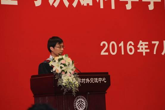 2010级博士生于宏波同学作为毕业生代表发言,他深情回顾了在心理学院的求学生活,回忆了与师生们的深厚感情和这些年的成长。他鼓励毕业生同学能够从爱中获得勇气,锻造一颗强大丰富的内心,“不受人惑”。最后,他感谢心理学院对他的培养和帮助,祝福各位老师身体健康,祝福毕业生同学学习工作顺利,祝福心理学能够继续发扬光大。