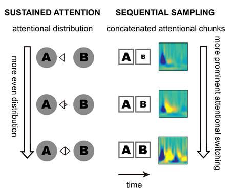 视觉系统在每时每刻都会收到大量信息,注意过程需要选择重要的信息来进行优化加工(“选择性注意”)。以往大量研究都集中在对一个物体的选择性注意方面(注意一个而抑制其他)。然而,自然视觉场景往往包含多个物体,大脑是如何在时间空间上灵活的分配注意资源来达到对多个物体的采样呢?