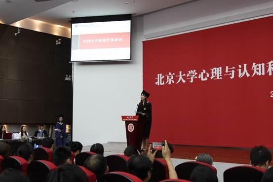 2013级本科生邵艺多同学作为本科生代表发言。她深情回顾了四年学习生活中难忘的点点滴滴,表达了对老师教导之恩、父母养育之情和同学相伴之谊的感恩,许诺将带着追求真理的精神、敢为人先的信念和齐家治国的担当前行,做一名“心怀天下,理想远大”的北大心理人。
