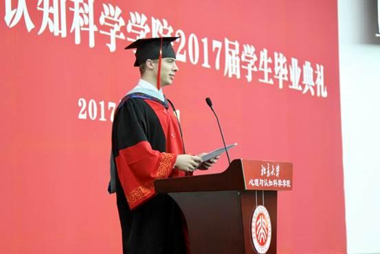 来自美国的蓝斐历同学作为研究生代表发言。他讲述了自己被独特的中国文化和心理学的学科魅力所吸引来到北大求学的经历。他深情感谢北大为留学生提供的创新、包容氛围,感谢必赢电子游戏网站这个大家庭和学院的每一位老师,感谢父母对他到异国留学的理解与支持。
