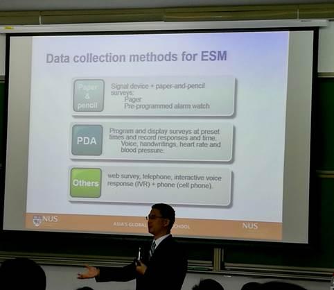 在下午的工作坊中,新加坡国立大学的博士候选人祝金龙介绍了ESM的数据收集方法,详细阐述了手机ESM数据的整理分析手段,并进行现场示范。随后,香港中文大学商学院的李文东博士对经验取样法在组织行为学中的应用状况和最新研究进展进行总结。