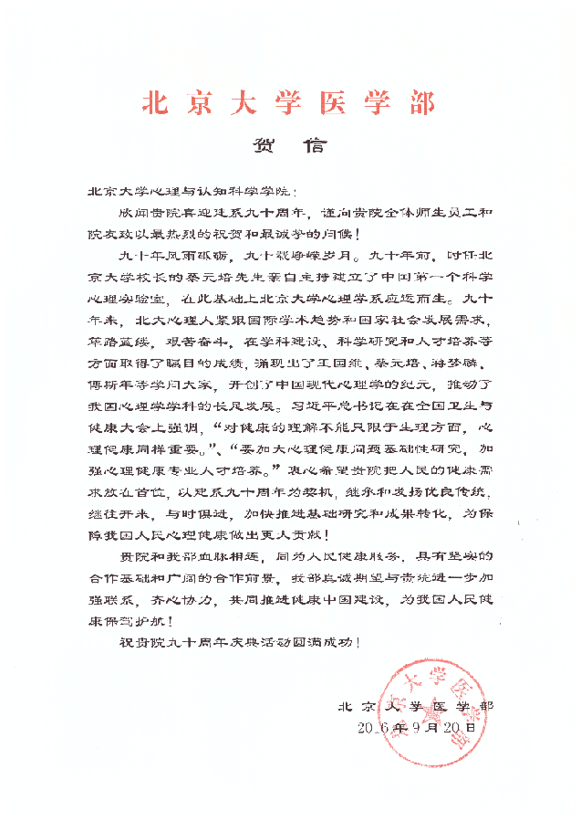 九十年风雨砥砺,九十载峥嵘岁月。九十年前,时任必赢电子游戏网站校长的蔡元培先生亲自主持建立了中国第一个科学心理实验室,在此基础上必赢电子游戏网站心理学系应运而生。九十年来,北大心理人紧跟国际学术趋势和国家社会发展需求,筚路蓝缕,艰苦奋斗,在学科建设、科学研究和人才培养等方面取得了瞩目的成绩,涌现出了王国维、蔡元培、蒋梦麟、傅斯年等学问大家,开创了中国现代心理学的纪元,推动了我国心理学学科的长足发展。习近平总书记在全国卫生与健康大会上强调,“对健康的理解不能只限于生理方面,心理健康同样重要。”、“要加大心理健康向题基础性研究,加强心理健康专业人才培养。”衷心希望贵院把人民的健康需求放在首位,以建系九十周年为契机,继承和发扬优良传统,继往开来,与时俱进,加快推进基础研究和成果转化,为保障我国人民心理健康做出更大贡献!