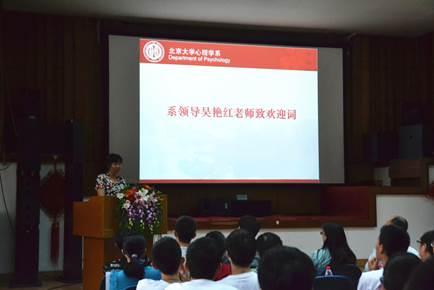 首先,系党委书记吴艳红教授代表心理学系全体教师向新生致以诚挚的欢迎。她希望同学们在北大心理学系能不断的认识自我、提高自我,鼓励同学们融入心理学系大家庭,珍惜在校学习的机会,在心理学系快乐地学习与成长,做一名快乐的心理人。