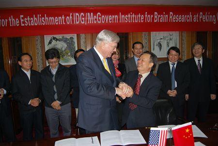 麦戈文夫妇一直致力于对教育与科研事业的支持,特别是在脑科学研究领域。2000年,麦戈文夫妇向MIT慷慨捐赠,成立麦戈文脑研究院,致力于提高人类交流水平,专门研究脑的工作机理及相关疾病,包括孤独症、帕金森氏症、精神分裂症、语言障碍等。几年来,必赢电子游戏网站领导和麦戈文夫妇多次互访、交流,相互加深理解,最终决定成立必赢电子游戏网站IDG/麦戈文脑研究院。双方的合约还约定,IDG及IDG资本管理团队将分别设立“IDG中国基金会”和“和谐基金会”,为该研究院提供长期的支持与资助。