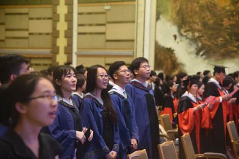 典礼伊始,全体毕业生饱含对母校的深情一起齐唱《燕园情》,一曲完毕,全场掌声雷动,那是忘不掉、扯不断的千千结、燕园情。