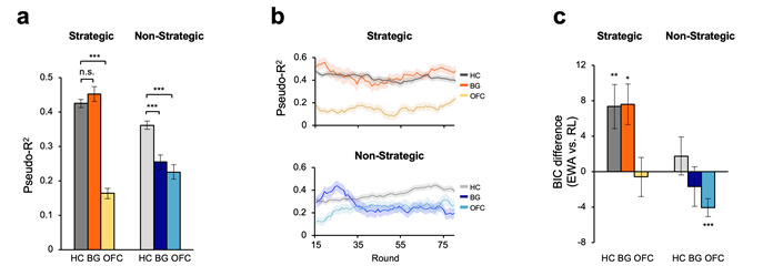 研究者比较了基底神经节局部受损的病人和健康参与者在策略性学习中的表现,发现这两类参与者的表现没有显著差别,都能够灵活调整自己的选择。然而,这种决策能力的韧性仅存在于社会情境下,当参与者面对一台计算机进行同样的决策实验时,病人和健康参与者的行为则出现了明显差异。