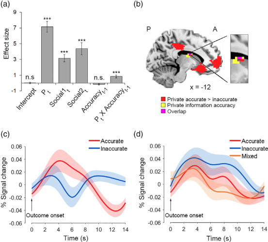 结果发现,当个人信息与社会信息不一致时,被试倾向于选择与社会信息相一致的选项。但是随着时间的推移,这种社会从众偏好比例逐渐下降。通过一般线性模型对信息的影响进行分析发现,个人信息的影响逐渐增加。进一步分析发现,前一个试次个人信息的准确性会影响下一个试次个人信息的作用。虽然对社会信息有效性也进行了操纵,但是并没有发现社会信息的作用产生变化。相应地,该研究发现在呈现结果反馈信息时,纹状体对个人信息是否正确预测有不同的激活,而对于社会信息正确与否则没有显著差异。另外,当个人信息准确时,纹状体与dmPFC的功能联结比个人信息不准确时更强。进一步分析发现,在决策阶段,dmPFC对偏离个人信息的监控也受到之前试次个人信息有效性的调节,前一个试次个人信息准确时,下一个试次dmPFC对偏离个人信息的监控更强。该研究揭示了信息有效性学习如何调节社会从众行为的的神经生理机制,也为避免不正确社会信息造成的负面影响提供新的思路。