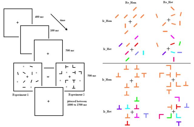 视觉选择性注意的一个重要问题是我们如何选择目标信息和排除干扰信息。视觉搜索任务要求被试在众多视觉干扰刺激中搜索目标刺激,是研究注意选择和注意抑制规律的常用手段。该领域的众多研究考察了目标项和干扰项之间的相似性,以及干扰项彼此之间的相似性对搜索效率的影响及其认知神经机制。但是,对于每一个搜索项目,都可能存在多种维度,例如,颜色、朝向、形状等。过去研究没有系统考察搜索项目多种维度的信息如何影响搜索效率,以及不同维度对搜索效率的影响在特征搜索(目标的定义基于单个特征)和联合搜索(目标的定义基于两个特征的整合)之间的异同。研究这个问题有利于解释大脑上顶叶区域在视觉搜索和选择项注意中的作用。