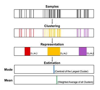 该研究提出,人们可能是采用样本聚类的策略来表征概率分布的。样本聚类的方式具体如下图所示。当人们面对大量来自一个分布的样本时(Samples),会对这些样本进行聚类(Clustering),并只记住聚类后每个类别的中心和相对权重(Representation),以完成对分布信息的简化表征。当需要对分布的特征作出估计时,人们会根据每个类别的中心和相对权重信息来作出相应估计(Estimation)。比如,人们会报告权重最大的类别其中心所在的位置作为对该分布众数的估计,对各类别的中心进行加权平均作为对该分布均值的估计。