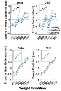在实验中,研究者在屏幕上一根白色横轴上给被试快速、序列地呈现70根红色的竖线,被试的任务为,在所有竖线呈现完毕后,指出刚才呈现的70根竖线出现最密集的位置(众数)和平均位置(均值)所在。结果发现,被试对于众数和均值的报告均存在系统性偏差(下图左上、左下),表明被试确实可能采取了某种近似策略来表征概率分布。进一步地,作者提出的样本聚类模型(CoS)可以很好地预测出被试估计值的偏差模式(下图右上、右下)。同时,作者总结了前人关于概率分布的多种表征模型,并将这些模型对数据的拟合与该研究中提出的样本聚类模型进行比较,发现样本聚类模型可以比其它模型更好地拟合数据。该研究为样本聚类模型提供强有力的证据支持,对于我们理解人们是如何加工生活中复杂的信息并作出响应有着重要的意义。