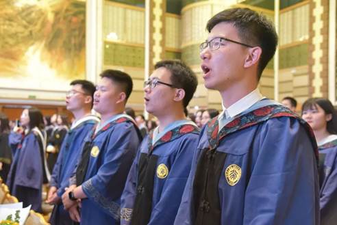 典礼伊始,全体毕业生齐唱《燕园情》,并一同观看了各班拍摄的纪念视频。本科班的《一期一会》纪念了美好岁月中的相遇和别离,学硕班用镜头记录了三年求学路上相伴相随的感人故事,专硕班的《我们的故事》则从不同专业的学术生活入手,讲述了从这里启程,走向五湖四海的人生篇章。
