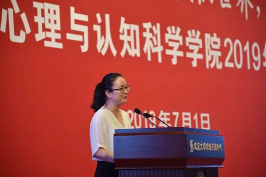 心理学院研究员朱露莎作为教师代表发言。她回忆了和同学们在实验室的工作的点滴和感动,尤其是同学们和老师之间朋友一样的相处模式,感谢同学们把老师们也当作平凡人去包容和体谅,同时也感谢同学们这几年所付出的努力。她认为,学习是一个双向的过程,需要师生共同努力。她还分享了自己的成长故事,向同学们阐述人生的选择不是心理学实验;没有对照组,但只要能做自己喜欢的事情,就好像是与自己的真爱朝夕相处,便是一件幸福的事。最后,她用林毅夫教授的话勉励大家:“中国的知识分子,追求的是一种‘虽千万人吾往矣’的精神”。希望大家能够做到以学术为幸福,勇往直前。
