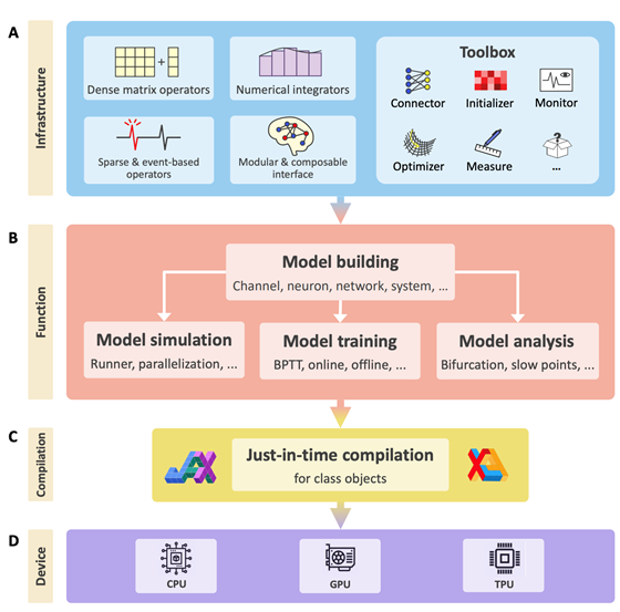 计算神经科学作为脑科学与类脑智能之间的连接桥梁,其目标是使用数学建模和仿真模拟的方法来阐明大脑的工作原理,同时为人工智能的发展提供新的模型和新的思想。任何一个学科的发展都离不开工具的进步。以人工智能为例,这一轮人工智能的快速发展很大程度上得益于深度学习框架(比如TensorFlow和PyTorch)的普及。深度学习框架目前已成为人工智能研究的基础设施,因为它们提供了一个通用的编程接口,能支持研究人员在各个领域灵活高效地定义各种AI模型。然而,由于计算神经科学中的脑动力学模型(Brain Dynamics Models)与现有AI模型的显著性区别,该领域长期缺乏一款类似于PyTorch和TensorFlow的、真正允许用户自主灵活编程的、简单易用但灵活高效、通用的脑动力学编程框架(General-purpose Brain Dynamics Programming Framework)。特别地,随着越来越多海量神经数据的产生、模型仿真复杂度的日益增长、建模手段、方法及目标的日趋多样化,我们比以往任何时候都更迫切地需要开发通用的建模工具,以帮助我们轻松构建、模拟、训练和分析多尺度及大尺度的大脑动力学模型。