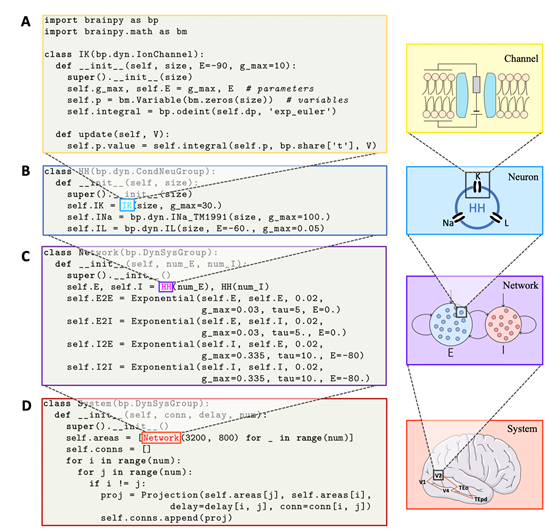 图2:使用BrainPy模块化和层级化地构建脑动力学模型