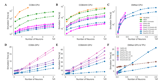 图3:NEURON、Nest、Brian2 和 BrainPy 在不同计算设备下的速度比较。