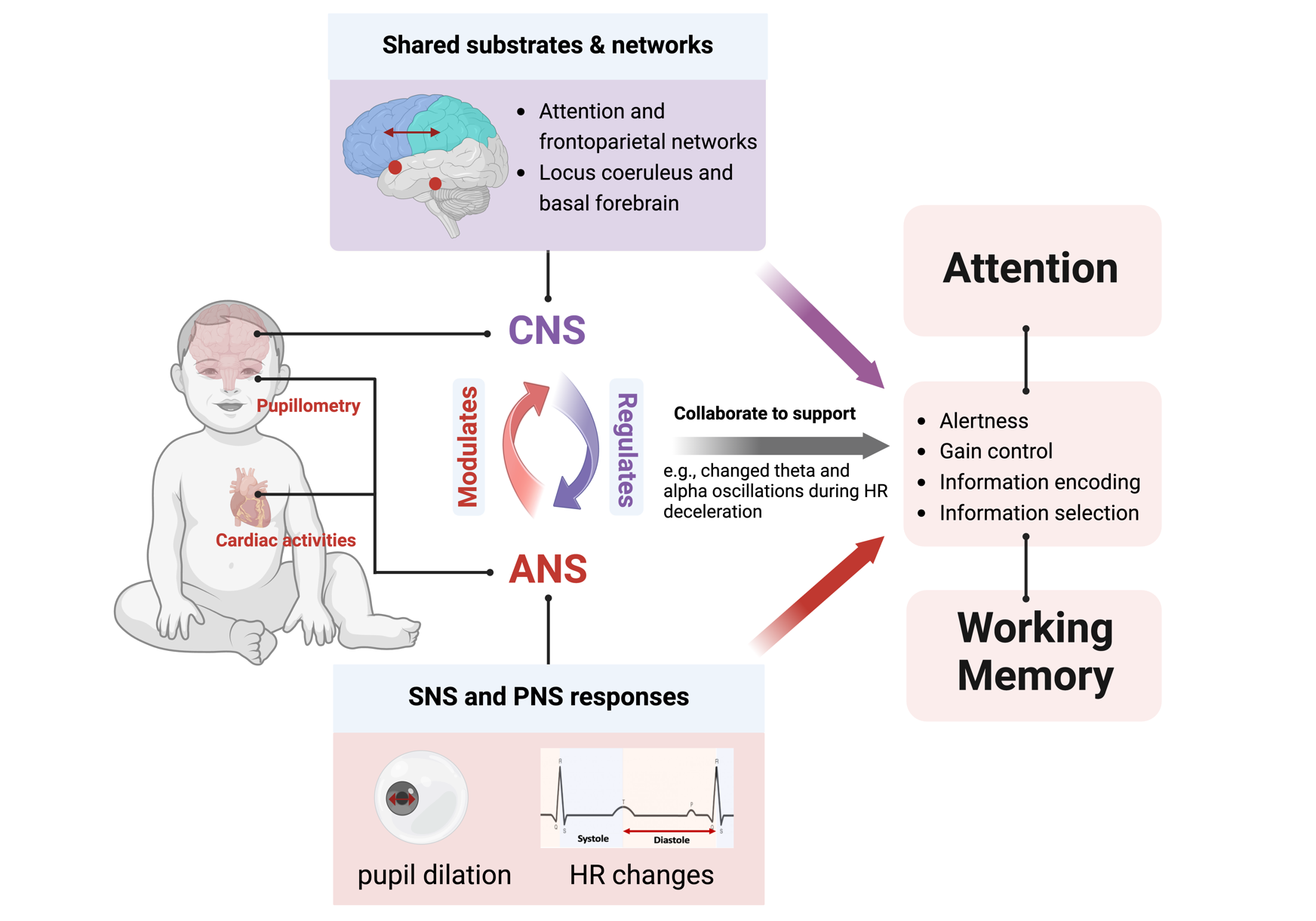 注:ANS与CNS之间的双向关系通过整合生理和神经机制,支持婴儿的认知发展,从而增强注意和工作记忆。ANS通过交感神经系统(SNS)和副交感神经系统(PNS)的反应,借助心率变化和瞳孔扩张等生理指标调节皮层活动,这些指标反映了影响注意和工作记忆的唤醒状态。共享的神经基质,包括额顶叶网络和蓝斑等,与ANS协作,调节警觉性、增益控制、信息编码和选择,这些都是注意和工作记忆的关键组成部分。另外,皮层-皮层下相互作用,例如心率减速期间的神经振荡变化,进一步优化了这些过程。