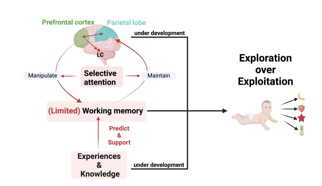 其次,我们探讨了婴儿工作记忆受限的潜在机制。选择性注意的不足使得婴儿难以优先处理相关信息;前额叶皮层(PFC)的发育不成熟限制了其执行控制和信息整合的能力;而先前经验的缺乏则阻碍了婴儿基于预测编码机制有效选择和更新信息(Fiske & Holmboe, 2019; Wang & Kibbe, 2023)。这些因素共同作用,使得婴儿在处理环境信息时倾向于采取“探索优先”策略。我们认为,这种策略不仅帮助婴儿避免错过环境中重要但非直接与任务相关的信息,还促进了其皮层功能的逐步成熟,为其认知学习和环境适应提供了独特的优势(如图2所示)。