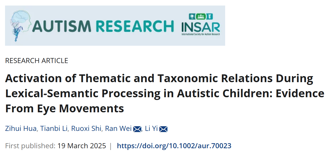 参考文献:Hua, Z., Li, T., Shi, R., Wei, R., & Yi, L. (2025). Activation of Thematic and Taxonomic Relations During Lexical-Semantic Processing in Autistic Children: Evidence From Eye Movements. Autism Research. https://doi.org/https://doi.org/10.1002/aur.70023